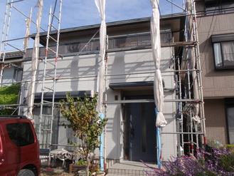 写真1枚目、外壁上塗り塗装中
