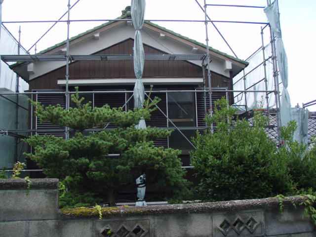 写真1枚目、中塗り外壁塗装中