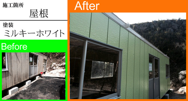 屋根塗装に「ミルキーホワイト」と、外壁塗装「パステル系グリーン」を使い